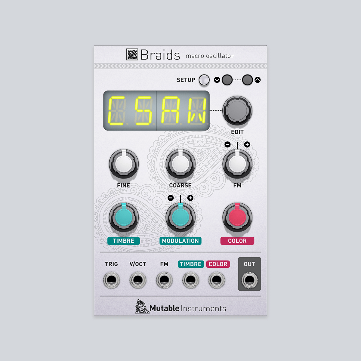 Braids, created by the French pioneers Eurorack Mutable Instruments, is not an oscillator. It’s kind of like one, with fine and raw pitch / frequency controls, v / oct input, and voltage controlled tone / timbre controls. It even sounds like one as it outputs sound.